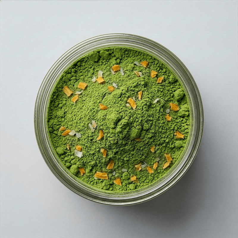 Matcha mango: ceremonial grade matcha powder, powdered cream of coconut, flavor, sucralose, malic acid, freeze-dried mangoes